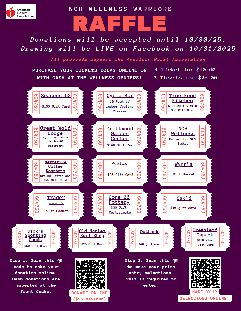 Join NCH Wellness Warriors in supporting the American Heart Association while winning amazing prizes! Choose your favorite gift baskets, gift cards, and experiences from local favorites like Seasons 52, True Food Kitchen, Driftwood Garden Center and more.