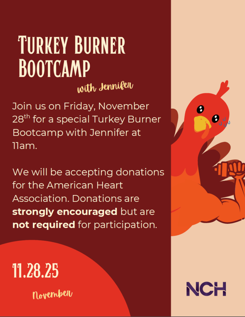 Get ready to burn off those Thanksgiving calories! Join Jennifer on Friday, November 28 at 11 a.m. for a special Turkey Burner Bootcamp.